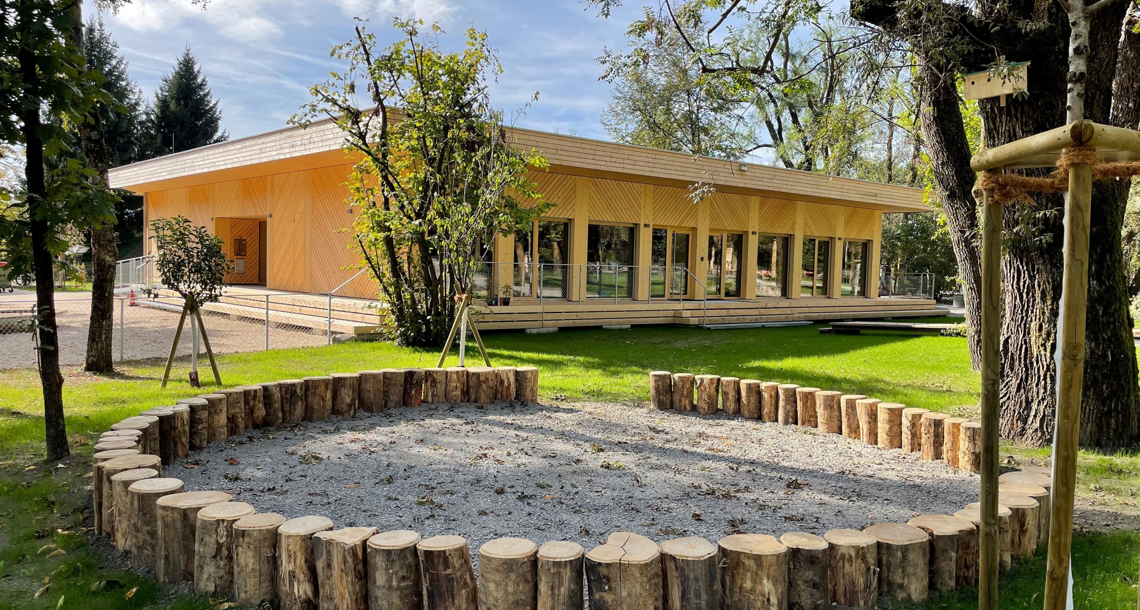 Holzbauspezialisten Johannes Kaufmann. Der Kindergarten wurde als eingeschossiger Pavillon errichtet;