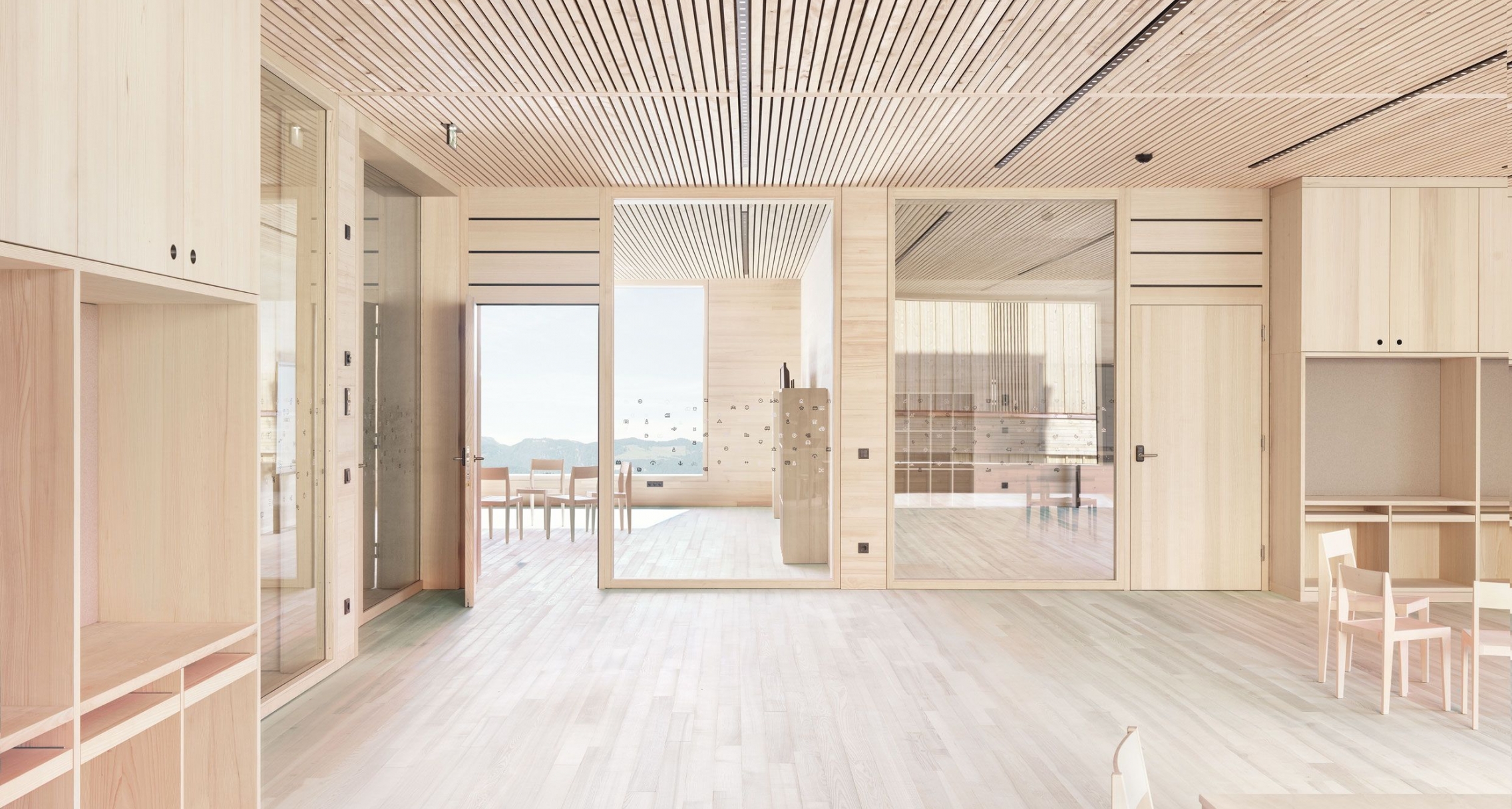 Es ist keine aktive Kühlung geplant, allerdings gibt es, ergänzend zu der Klassenzimmerlüftung, eine Nachtlüftung über motorisch angetriebene Fensterflügel, die je nach Bedarf und nach Außenklima für eine Querdurchlüftung der Räume aufgefahren werden.